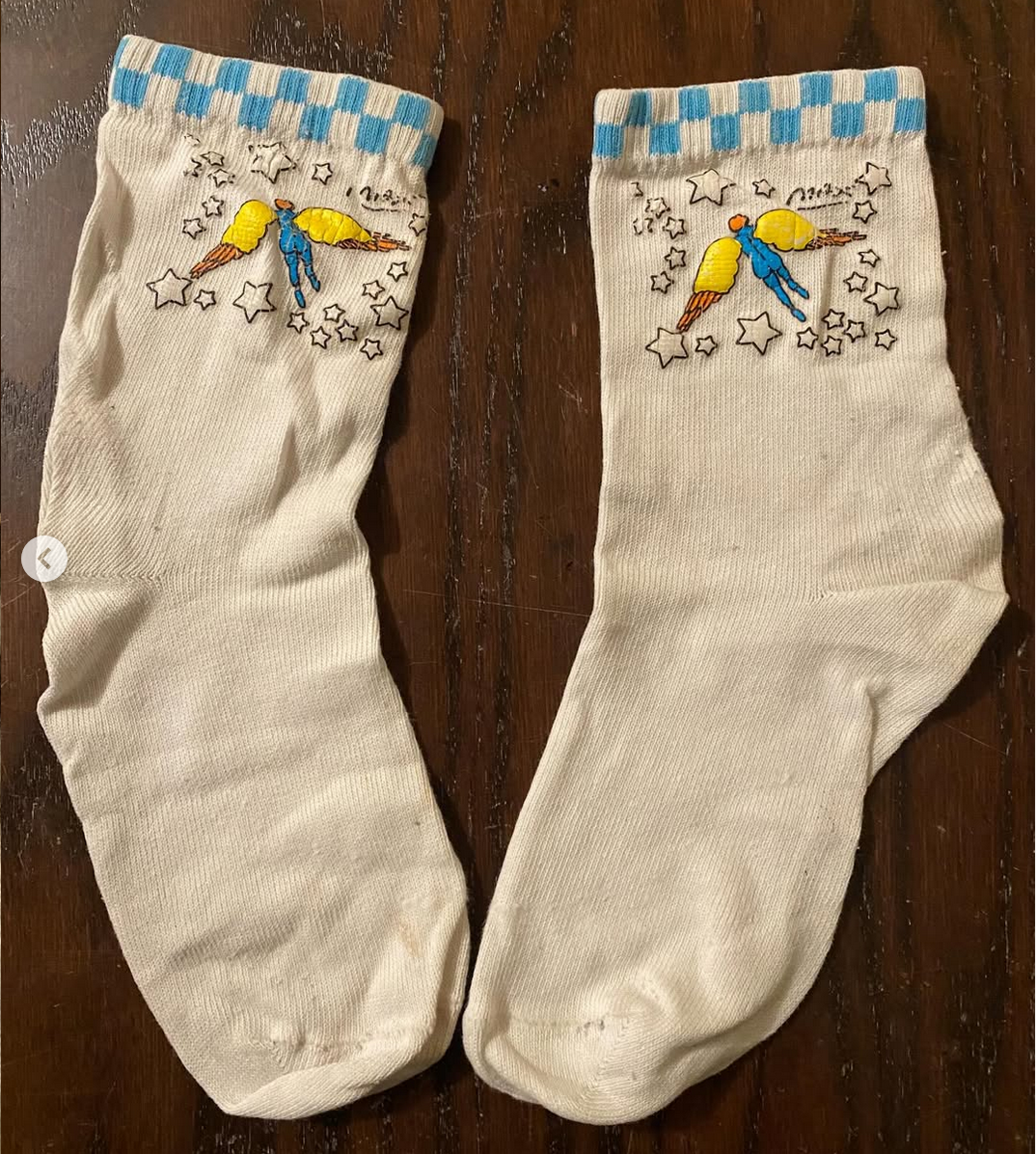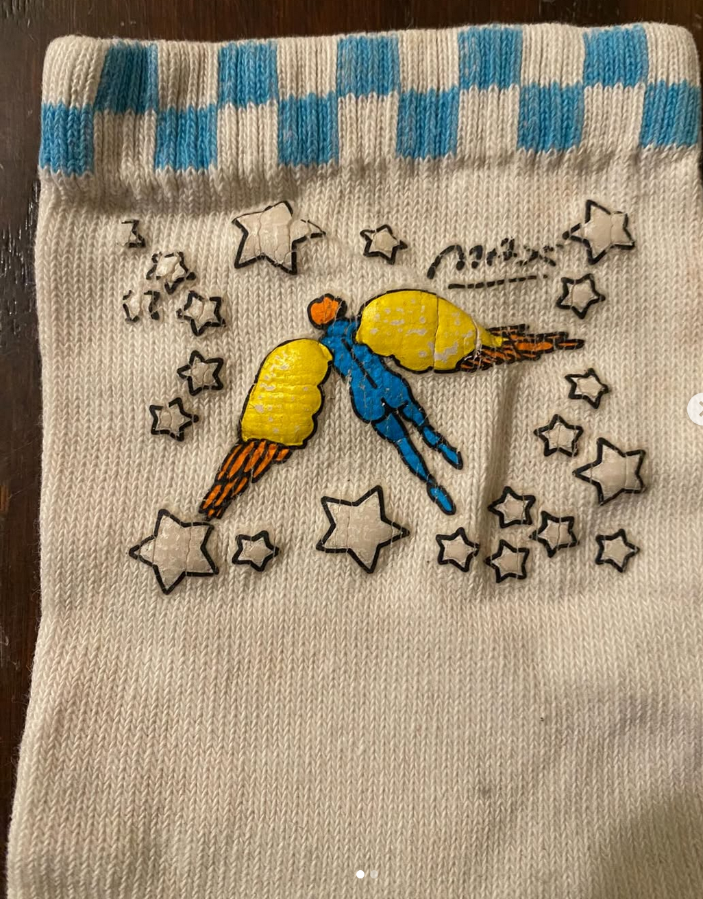 Pair of vintage Peter Max Icarus women’s socks. Very cool with blue checkered pattern at top. Is a woman’s medium (would probably fit up to a size 8).